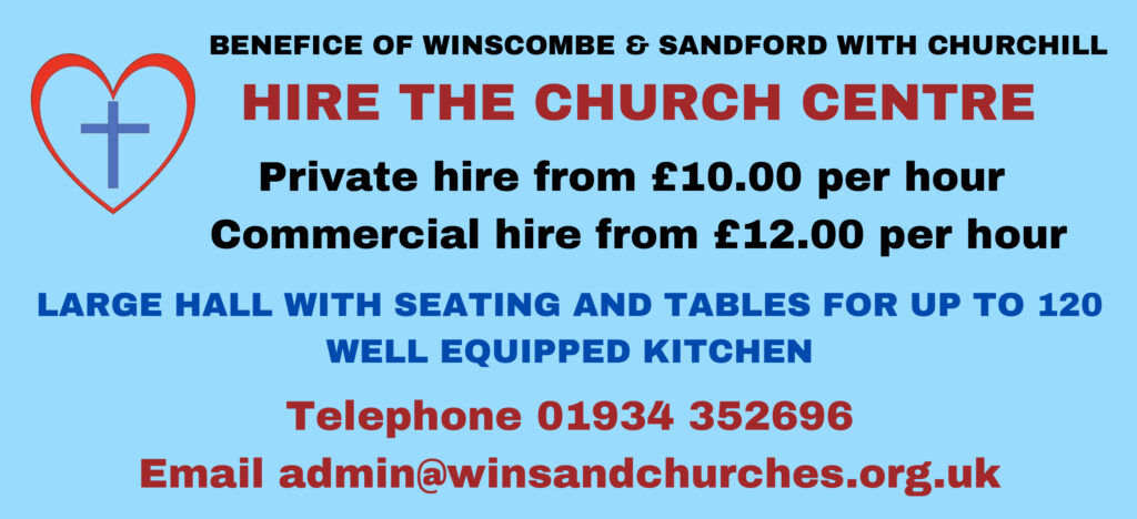 The Parish of Winscombe and Sandford can offer several spaces for hire for your events or meetings. These include the two churches, Our Church Centre (St. James’s Church Hall) and two smaller meeting rooms, one at at each church. Information about each venue can be found on our online booking system https://hallbookingonline.com/winscombe